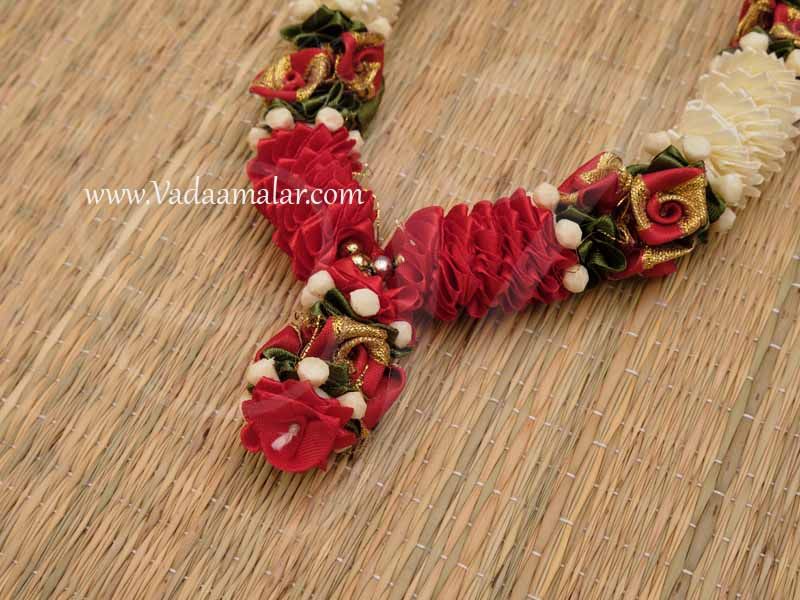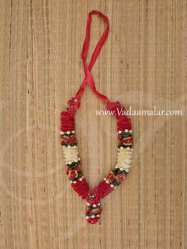 Light weight pooja garland ideal for small statues and photo frames. It is made of satin fabric and beads. Wide variety of garland mail available at Vadaamalar Online.