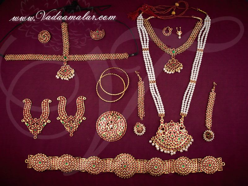 10 pieces kemp stones jewelry full set. This south India jewelry set has white and red stone in stunning designs. Used by Kuchupudi and Bharatanatyam dancers.