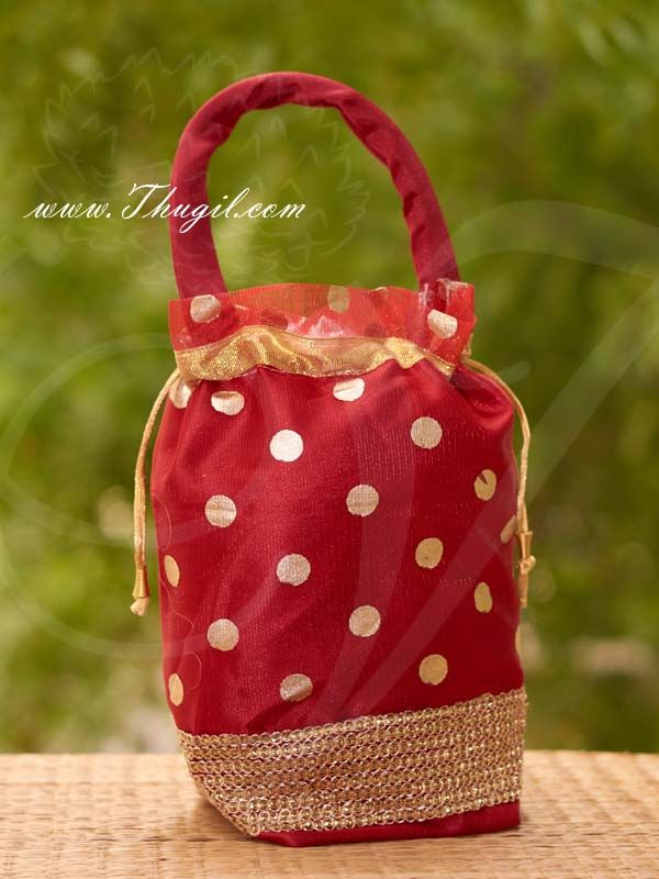 Small size beautiful tissue gift bag. Eco friendly tissue fabric thamboolam cloth bags potli pouch. Also called Batwa pouches they come in beautiful gold colour ranges. Simple and elegant Indian Gift bag.