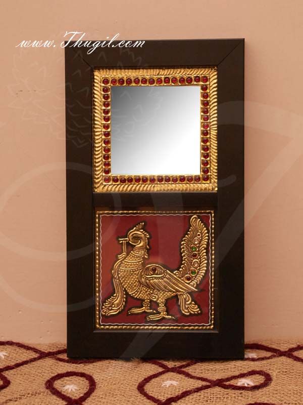 Handmade wooden mirror frame with peacock design. The parrot is done in Thanjavur / Tanjore style of Art.