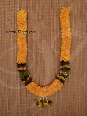 The hanging pieces represent fresh flowers. They are believed to bring good luck. Maalai is lso used during weddings and pujas. Garlands from India at best price.