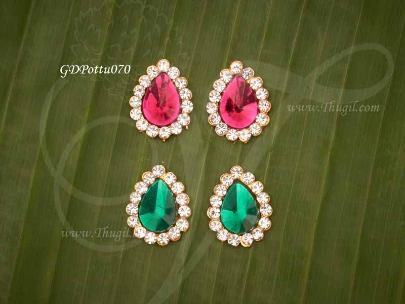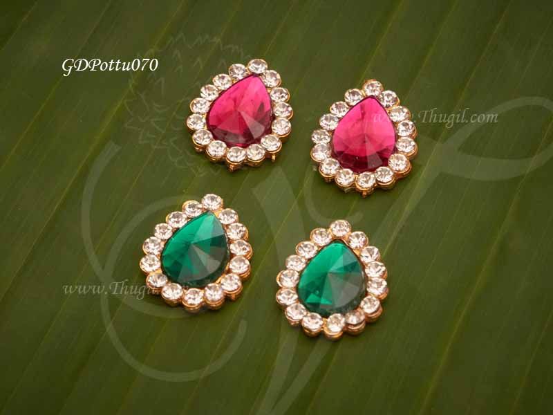 Deity forehead tikka bindi. Gold finish and white with red and green colour stones. These round jewels are worn on forehead like bindhi for deity Goddess statues.