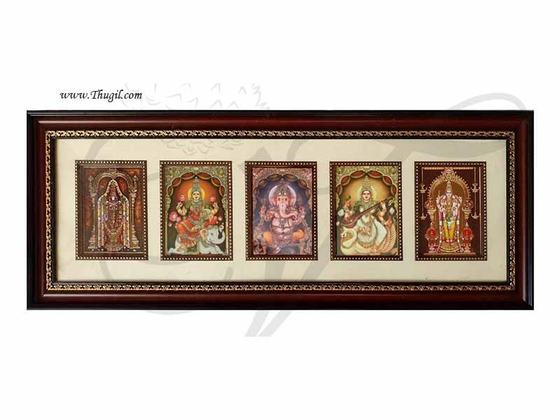 Photo frame of 5 God and Goddess. Good quality pictures of Goddess Balaji, Goddess Saraswathi, Goddess Lakshmi, Parvathi, Lord Murugar and Lord Ganesha. Wooden Laminated Picture Frame to Decorate your Home.