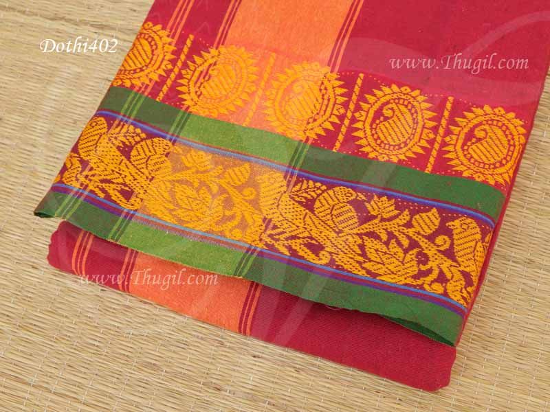 Red color cotton dhoti with border elegant to be worn for special occasions. Also known as Vesti Chadar