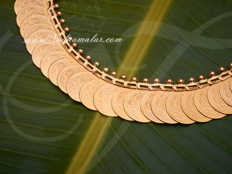 Gold Kasumalai with eloquent & symmetrical gold coins well formed. Also known as the coin necklace or kasu mala this traditional set is suitable for all Hindu Gods.