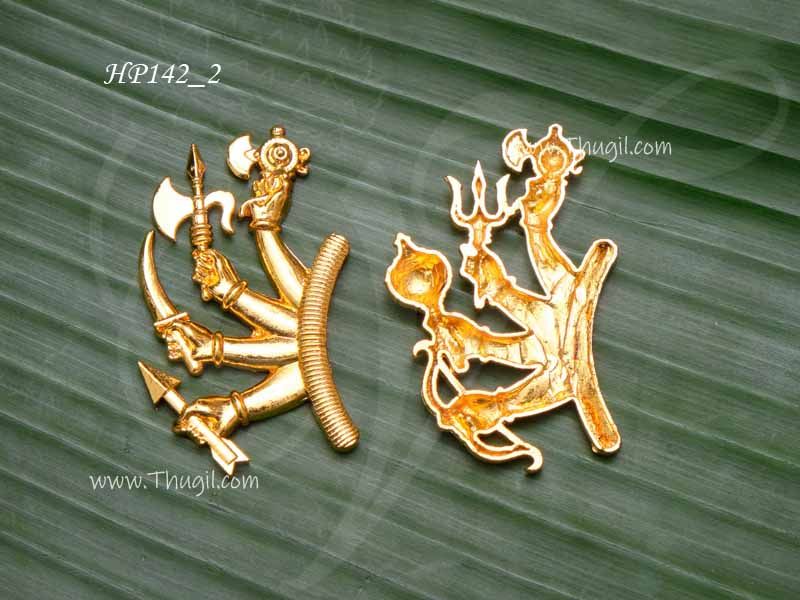 Gold polish durga alangaram hand set.  Used to decorate the statue of Goddess”Ashta Bhujha” or eight. Goddess Durga is depicted as a warrior woman with eight hands carrying weapons of different kinds (used in different situations), assuming mudras, or symbolic hand gestures that represent her teachings.
