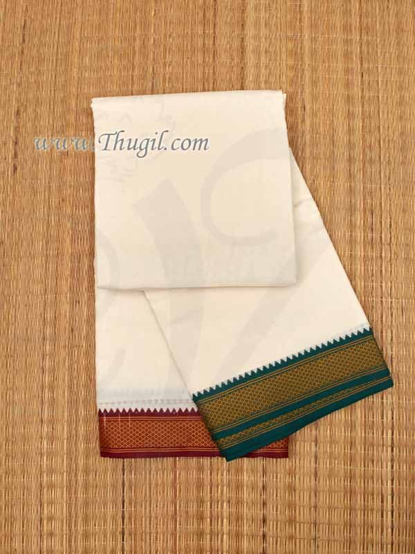 Items : 1 Dothi Off White with red and green border Description : Good quality pure white cotton dhotis. Double size border in green & red colours Used during pooja and festivals. Traditional Indian costume. A rectangular piece of un-switched cloth, it is wrapped in a simple manner about the waist and legs. Environmentally friendly as it is pure cotton. Easy to wash.