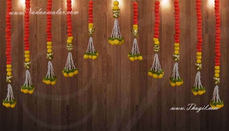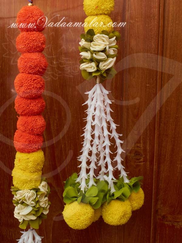 Synthetic fabrics arranged yellow with orange marigold flower to look like a beautiful flowers. Toran type decorative piece is used to hang above the doorways to welcome Gods as well as the people into the interior of the house or hall.