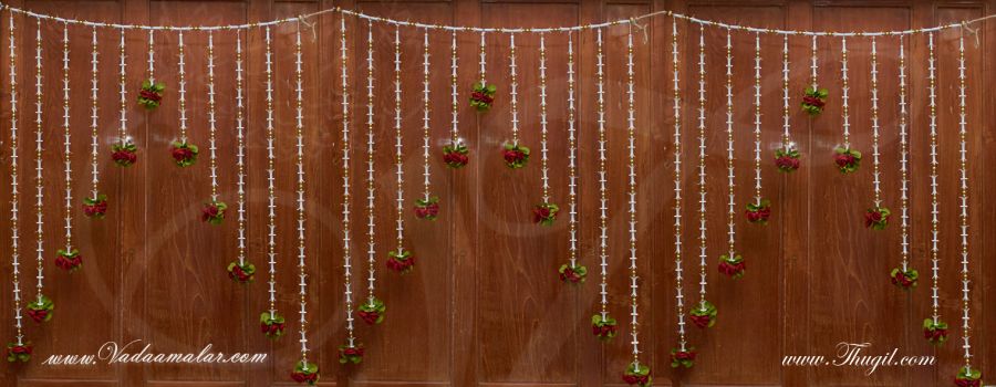 Elegant Indian festival deocration with artifical flowers. The hanging jasmine design synthetic cloth flowers. They are believed to bring good luck. Also used during weddings and pujas. Decorations for wedding halls, temples and festivals.