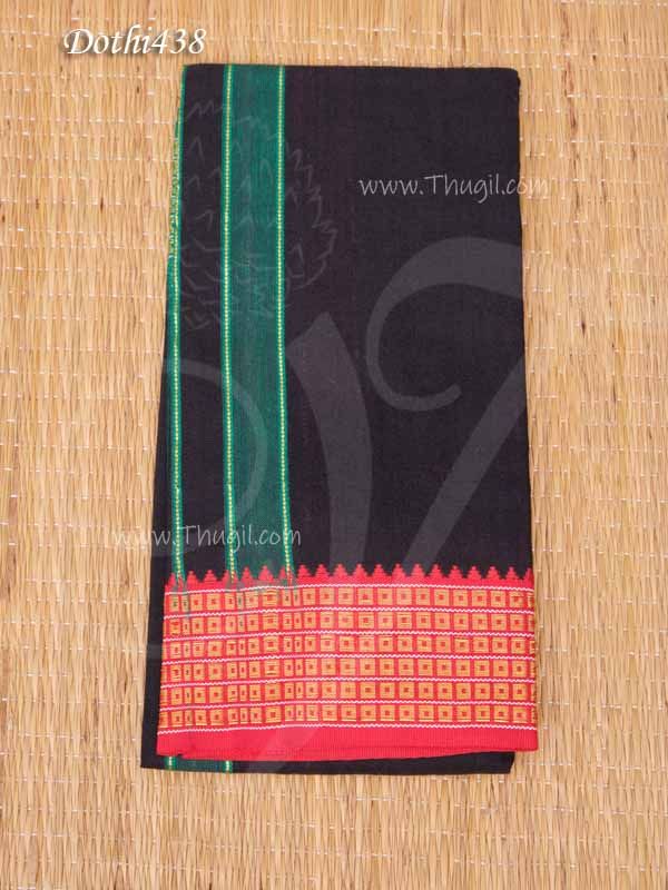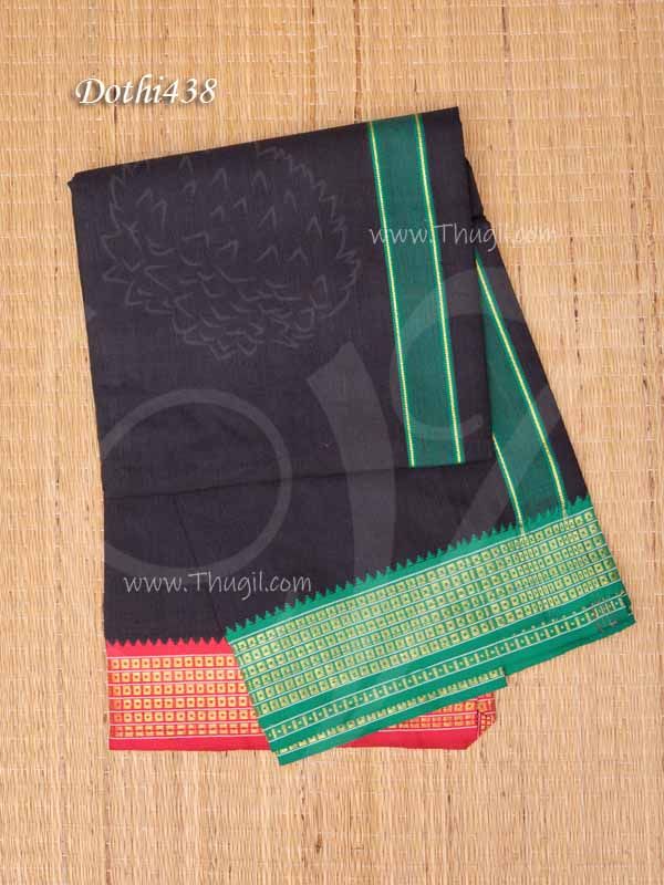 Black cotton Dhoti + Thundu with mayil kann border. Puja Dhothi/ Thundu for Lord Ayyapan. Used for Swamy Iyapan during Puja and special occasions.