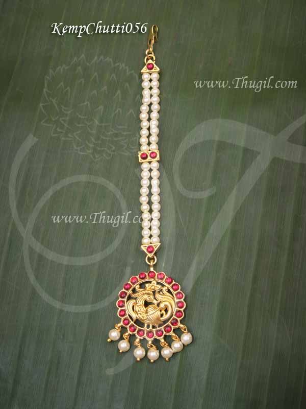 Peacock design kemp red with green stones chutti forehead mang tikka jewellery for the forehead. Also know as nethi chutti it is mainly used during special occasions or weddings.