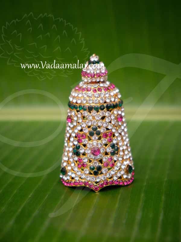 Mukut for God and Goddess. This beautiful Kreedam is made of metal and decorated with glittering stones. This is a full crown made to fit the entire head of the Swamy or Devi.