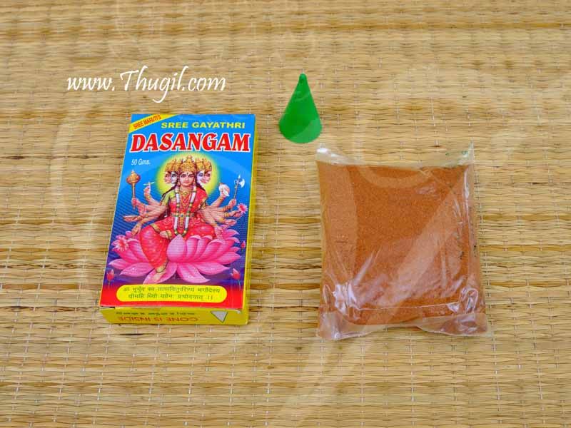 Dasangam powder has basic 10 incredients – Kukiil, Kungililyarn, white Kungiliyam, Koraikizhangu, dhevadharu wood, Sambrani, Karahil sticks, sandalwood, Vilamichai root, mattipal.