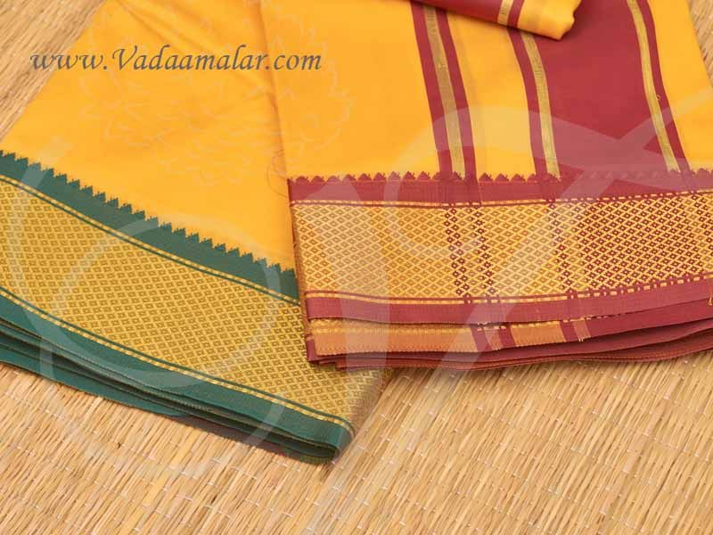 Good quality dhotis yellow colour with red and green border. Used during Puja and special occasions.