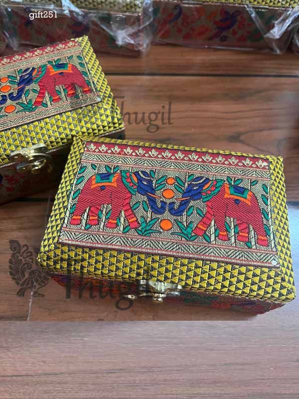 Beautiful rectangle box for gift hampers and return gift. Embroidery colourful elephant and flower design box makes for a beautiful return gift for special occasions.