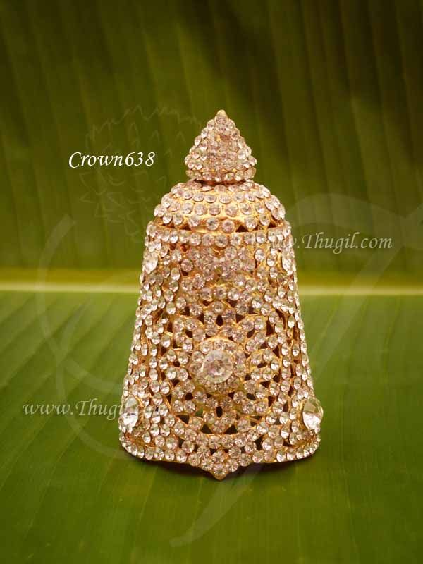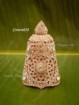 Mukut for God and Goddess. This beautiful Kreedam is made of metal and decorated with glittering stones. This is a full crown made to fit the entire head of the Swamy or Devi.