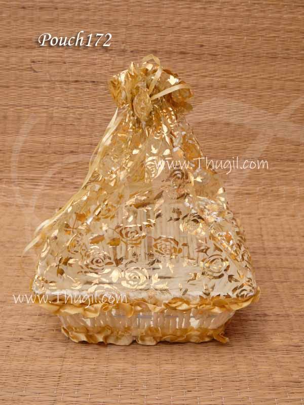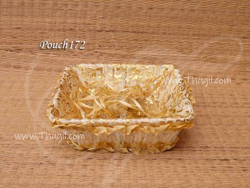India hand-crafted net ribbon gold colour gift box. Fruit & chocolate basket. This cute basket can be used as a container to gift fruits, dry fruits, etc.