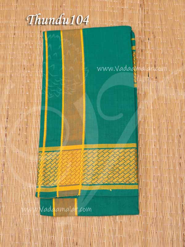 Green with yellow thread border Thundu. Pure cotton towel called as Angavastaram. Used with Dothi or Pajakajam.