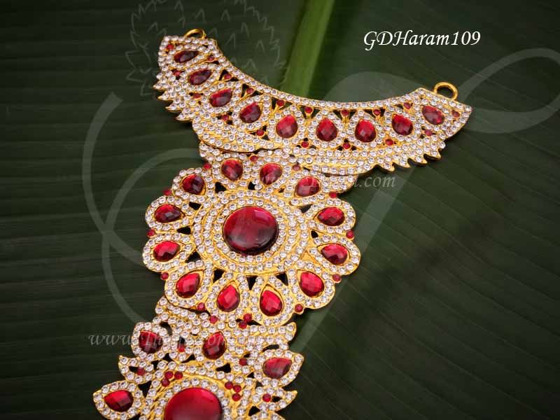 Dazzling Necklace Sets in glittering White with Red Stones colour stones. Elegantly Jewelry for Deity. Studded marbu kavasam for murthi decorations.