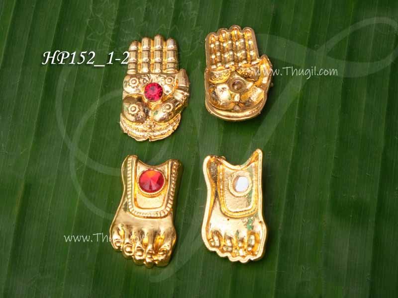 Mini Hastham and Patham in good quality gold polish with one big center stones. Ornaments for Deity / Swami Alankaram. Hasthalu and Pathalu sets for all Indian Gods and Goddesses.