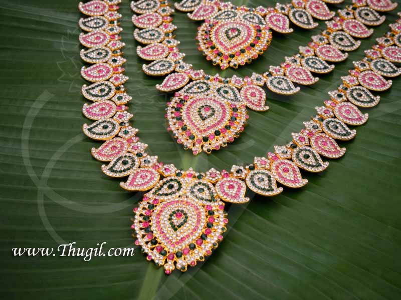 Description :Â Glittering Multicolor stones Maanga necklace set for idols and statues. Designed to adorn the chest of deity statue of God and Goddess.