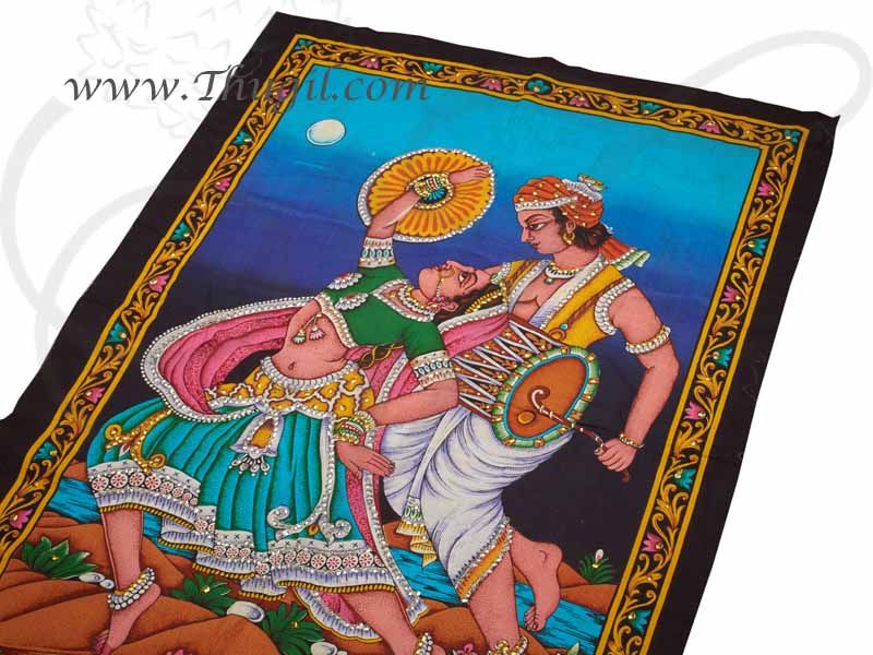 Unframed cloth with folk dance printed with bright colors and sequin work done on it