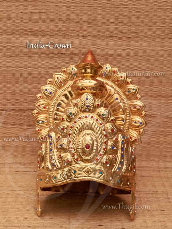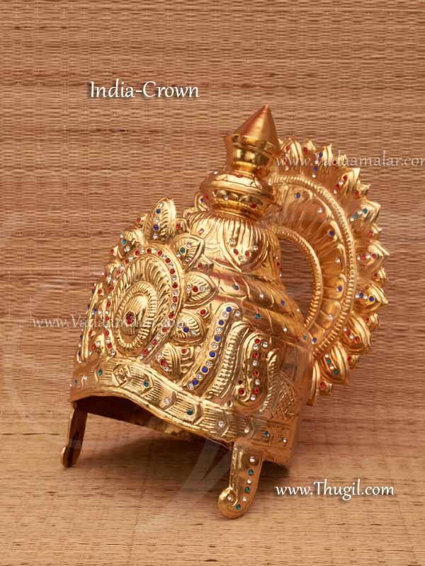 Gold colour Indian design Crown. Maharani or Goddess Kreedam. Metal crown decorated with glittering stones. Used for Indian Goddess , Statues and fancy dress costume and dance dramas.
