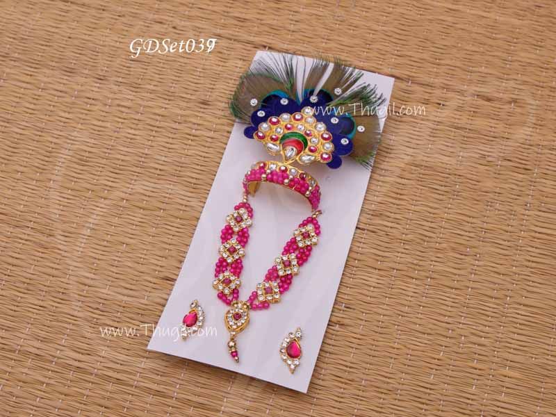 Lord Krishna crown,earring,necklace decorated with stone beads. Used for Krishna deity.Used for Krishna deity.Typically made from materials like pink and white decorative beads,