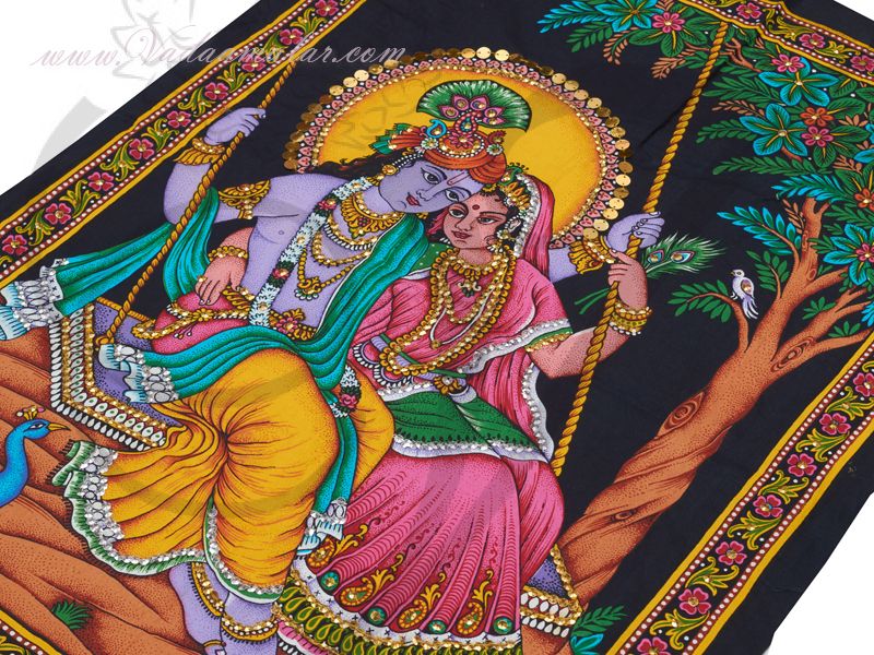 Lord Krishna & Radha in sitting posture printed with bright colors and sequin work done on it.