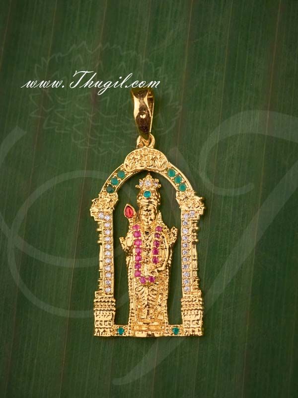 Description : Lord Murugar design pendant in micro gold finish.American Diamond and Ruby Emerald Stone.
