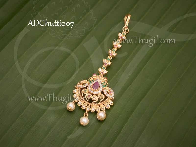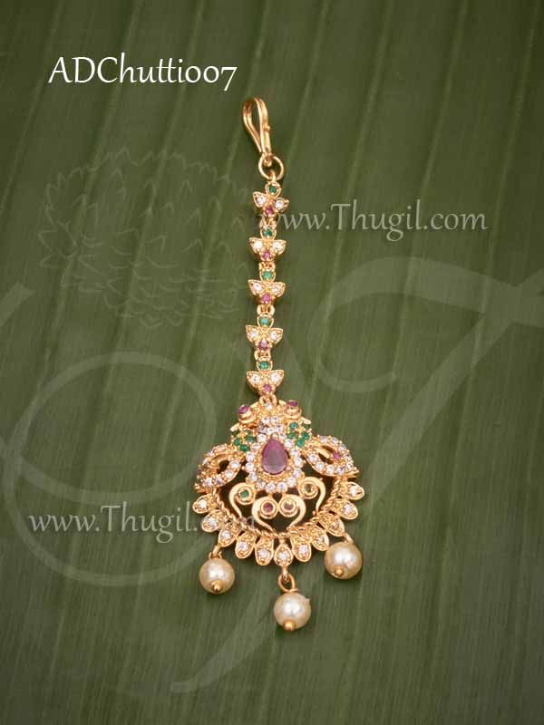 Description : American diamond and ruby stones design forehead mang tikka jewellery for the forehead. Also know as nethi chutti it is mainly used during special occasions or weddings.