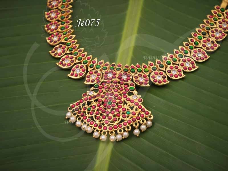 Temple jewelry manga malai with red and green kemp stones. Medium size mango design necklace.