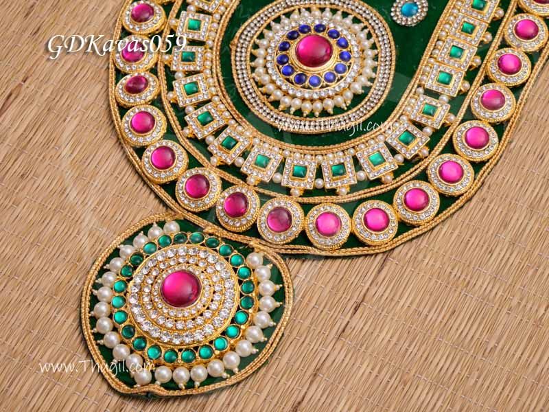 Marbu kavasam for God and Goddess. Stone studded chest necklace made of cloth and decorated with beads and sequins, this necklace features vibrant multi-colored stones.