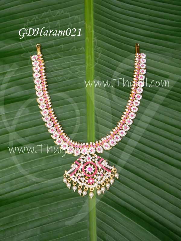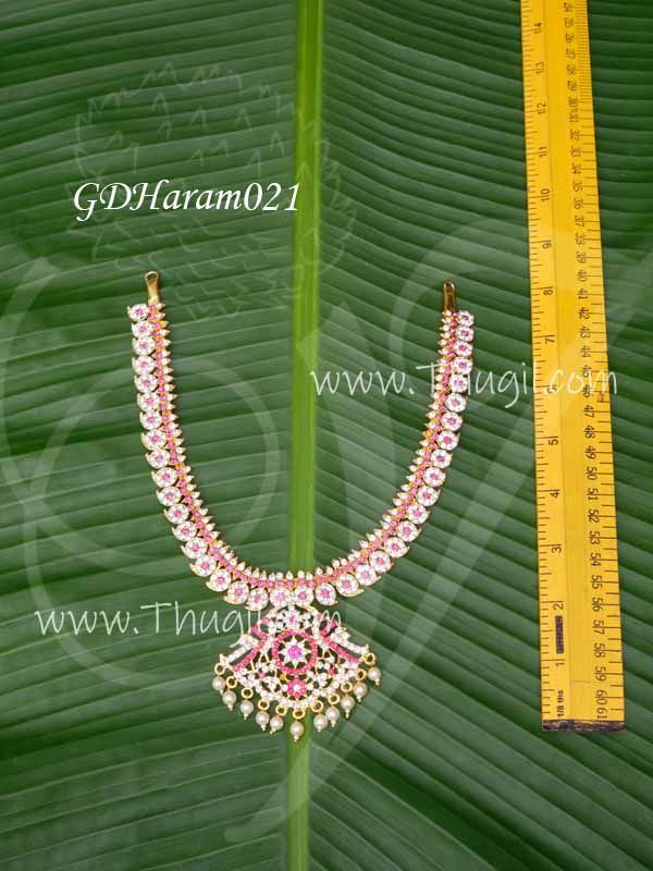 Long Manga Mala / Mango necklace. Medium size dazzling necklace sets in glittering stones. Elegantly jewelry for Deity, Idols and Swamy alankaram.