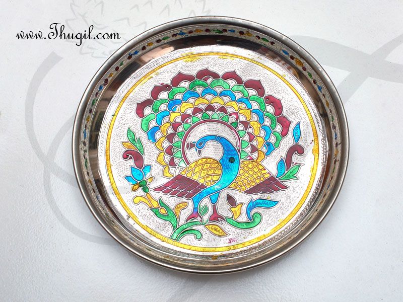 Beautiful meenakari Peacock designs on stainless steel plate. Elegant designs for gift or home decoration.