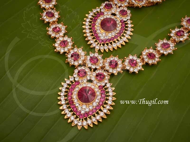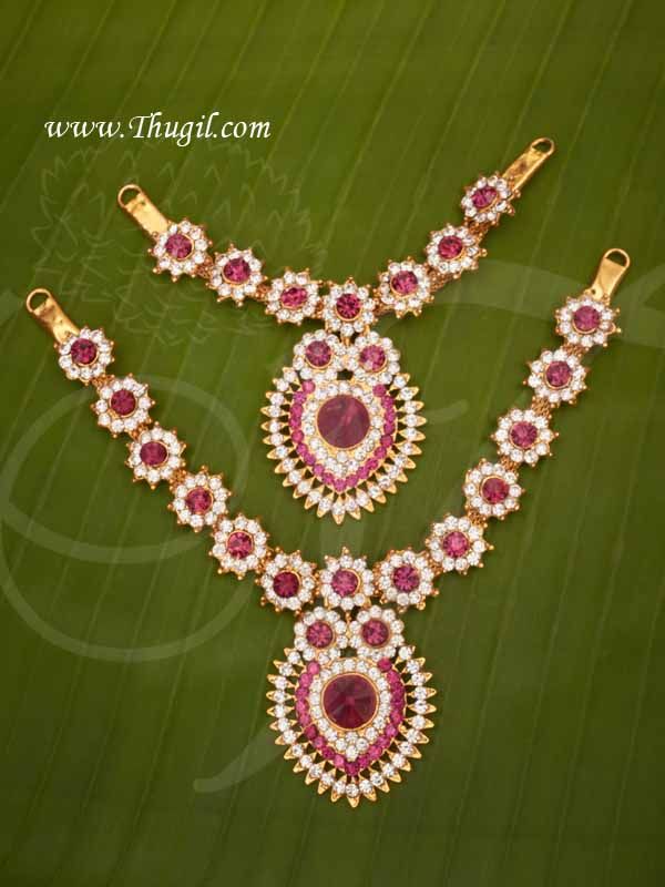 Description : Glittering white with pink stones necklace set for idols and statues. Designed to adorn the chest of deity statue of God and Goddess.