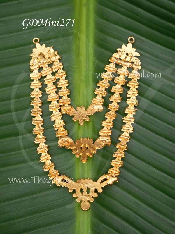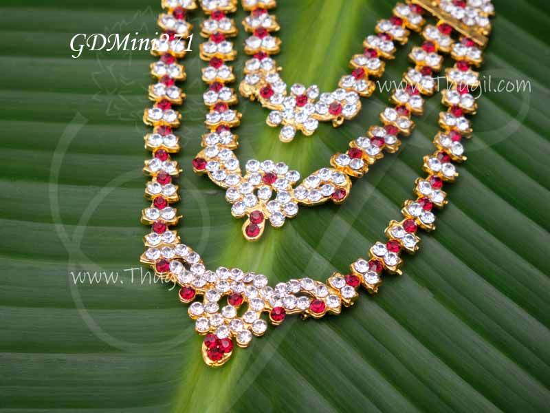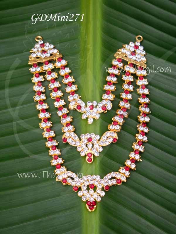 Dazzling 3 Step necklace sets in white with pink stones. Elegantly jewelry for Hindu God and Goddess. Miniature size necklace jewellery for small size Idols and statues. Design may vary slightly. How to maintain : After use, wrap it in a soft cloth. Avoid contact with water.