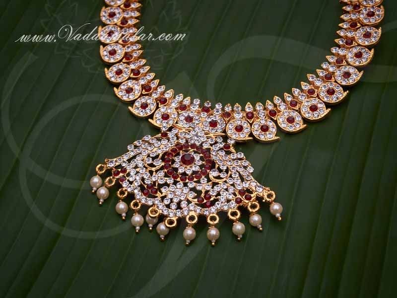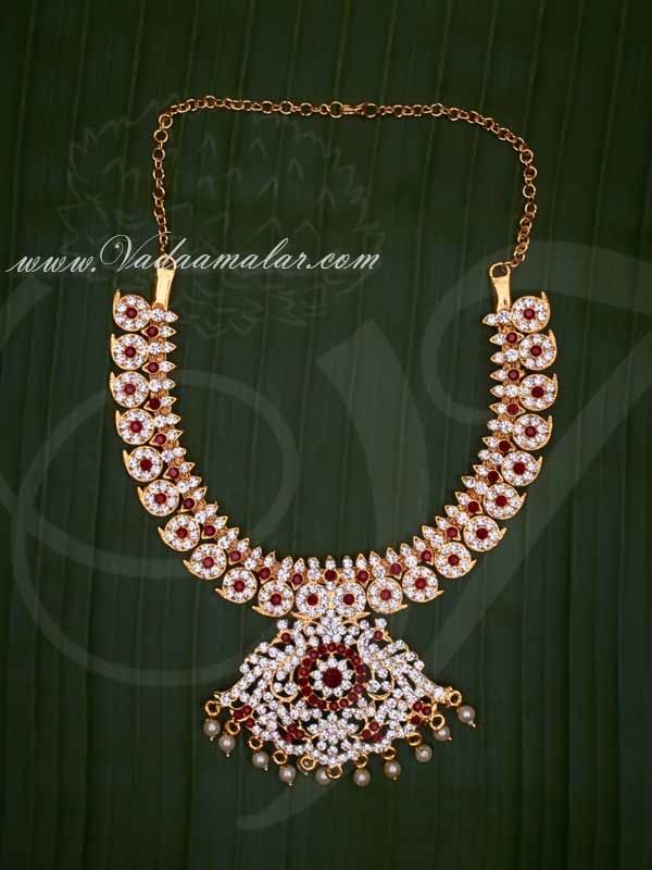 Necklace with a mango design, featuring glittering white and maroon stones. Also called as Mango necklace for Shringhar.