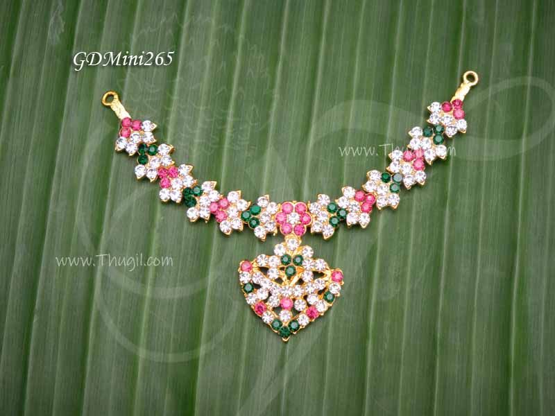 Necklace small size white with pink ,green colour stones set for idols and statues. Designed to adorn the chest of deity statue of God and Goddess.