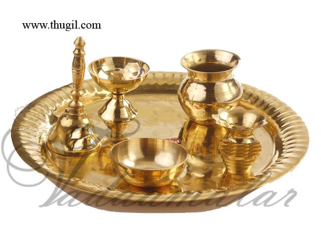 Large Pooja Thali Plate(diameter) : 10″/ 25.4 cm Diya Height : 3.5″/ 8.9 cm Small Kalasam : 2.6″/ 6.8 cm Kumkum Tray(diamter) : 5.5″/14 cm Aggarbati Stand : 1.8″/4.8 cm Bell “Thali” means plate or tray prepared to bless people when they enter a home. This thali set contains Note: Measurements are approximate. There could be slight deviations.