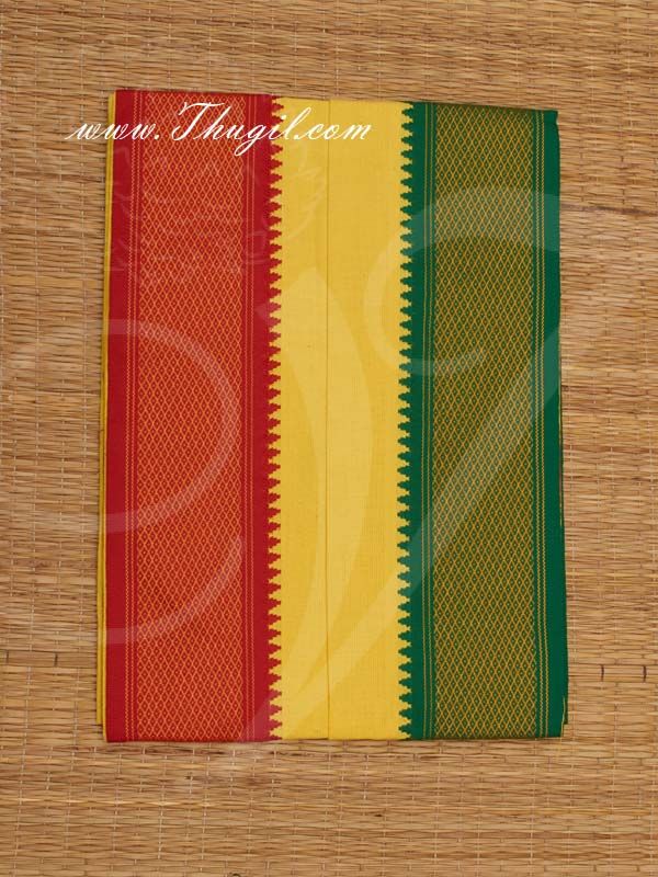 Description :Â Good quality pure cotten angavastaram with green & orange borders. Traditional Indian costume to be worn over the shoulder. Environmentally friendly as it is pure cotton. Easy to wash. Best Ethnic wear for traditional functions, weddings or special occasions.