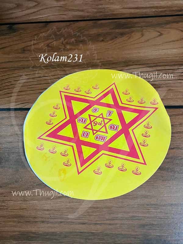 A beautiful set of kolam sheets with Om saravana bhava design on it. Decorative rangoli for any occasion in South Indian style. Round Muglu with Tamil print design. Easy to use self adhesive stickers.