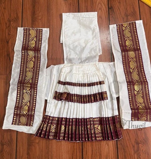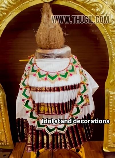 This skirt can be easily worn by tying the strings around the waist of the Goddess statues. The pallu part is given to cover the top part of the idols.