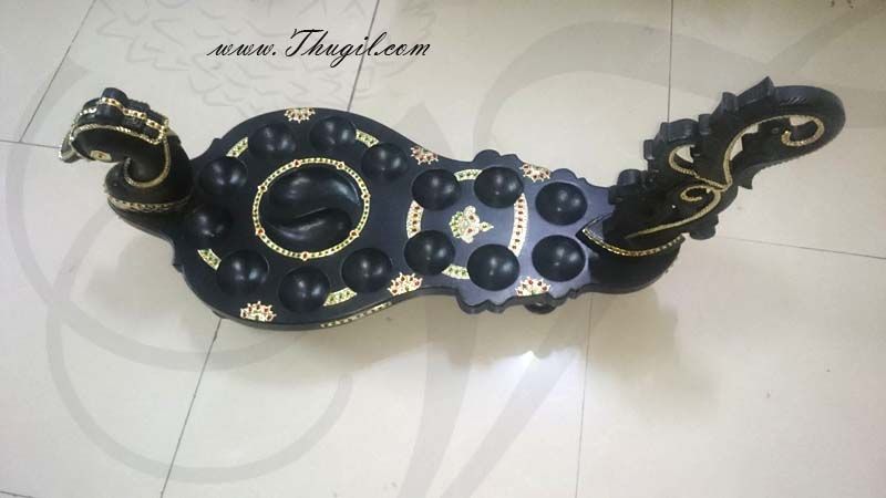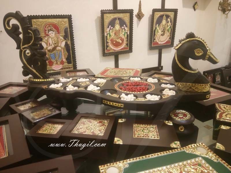 Stunning pallankuzhi in peacock like shaped. Golden foil Tanjore work studded with semi-previous stones. The whole piece can be dismantled and can be fixed easily.