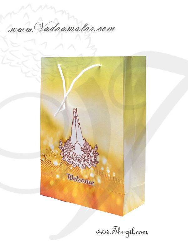 Traditional looking paper bags or pouches. These bags are used for return gifts. Paper pouches or Thamboolam bags, during weddings, festivals, puja and special occasions surprise your guests with authentic India bags.