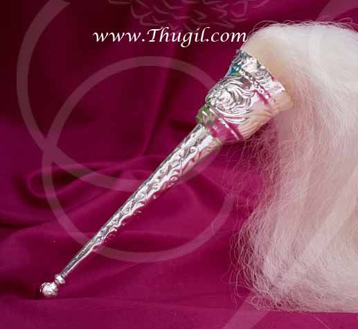 White metal Vensamaram. Hand waving chawer/chawar/chanwara / chaur sahib are made from super soft hair. Long handle Venjamaram with easy to grip long German silver handle. Chawar used during pooja available. Wide variety of Hindu Pooja saman at Thugil, India.