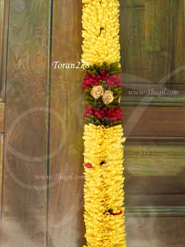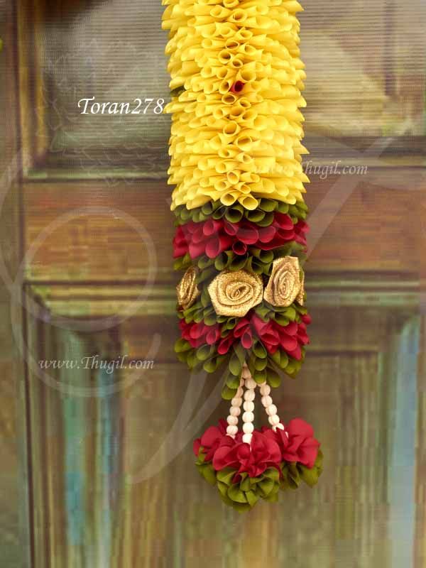 Indian flower design door decorative garlands. Toran type decorative piece is used to hang above the doorways to welcome Gods as well as the people into the interior of the house or hall. Mandaps, temples of homes these malas give a authentic feel to the place.  The hanging pieces represent red flowers. They are believed to bring good luck.